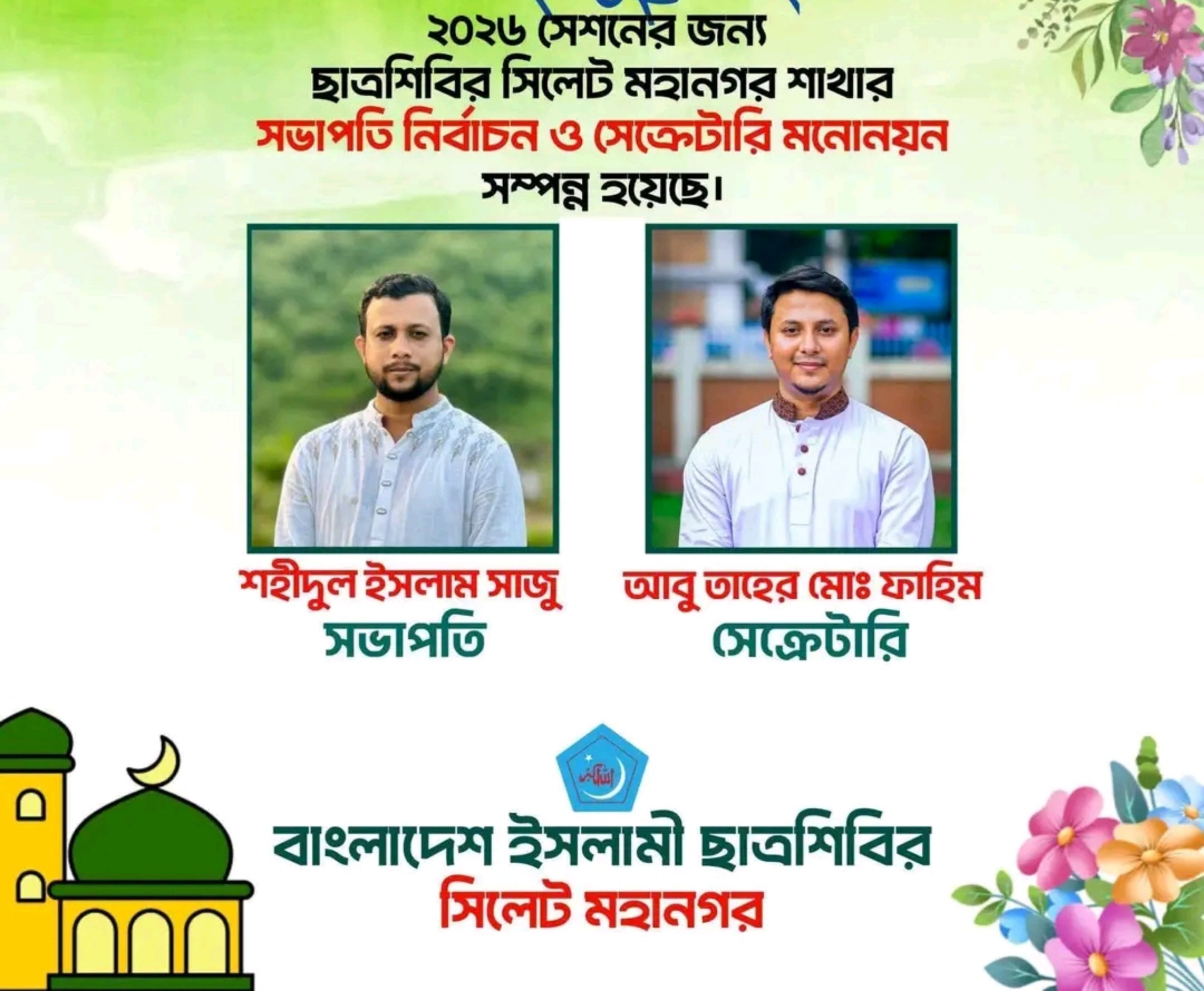 ২০২৬ সেশনের জন্য বাংলাদেশ ইসলামী ছাত্রশিবির, শাহজালাল বিজ্ঞান ও প্রযুক্তি বিশ্ববিদ্যালয় শাখার সভাপতি নির্বাচন ও সেক্রেটারি মনোনয়ন সম্পন্ন হয়েছে। সদস্যদের প্রত্যক্ষ ভোটে সভাপতি হিসেবে নির্বাচিত হয়েছেন মাসুদ রানা তুহিন এবং সেক্রেটারি হিসেবে মনোনীত হয়েছেন মুজাহিদুল ইসলাম। ১৮ ফেব্রুয়ারি শাখার সদস্যদের নিয়ে সদস্য সমাবেশ অনুষ্ঠিত হয়। কেন্দ্রীয় প্রচার সম্পাদক আজিজুর রহমান বিস্তারিত..