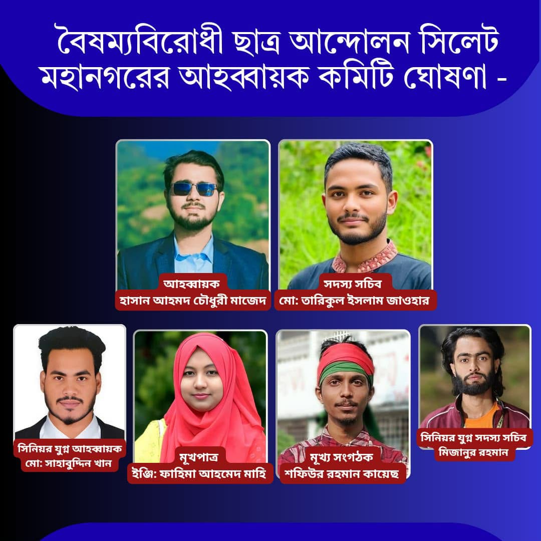 . সিলেট, ১৫ ফেব্রুয়ারি (রবিবার): বৈষম্যবিরোধী ছাত্র আন্দোলনের ভেরিফায়েড ফেসবুক পেজে সিলেট মহানগরের ৫১ সদস্যবিশিষ্ট আহ্বায়ক কমিটি ঘোষণা করা হয়েছে। সংগঠনের সভাপতি রিফাত রশিদ, মুখ্য সমন্বয়ক হাসিবুল ইসলাম এবং সাংগঠনিক সম্পাদক মুইনুল ইসলামের স্বাক্ষরিত প্যাডে ছয় মাসের জন্য উক্ত কমিটির অনুমোদন দেওয়া হয়। ঘোষিত কমিটিতে আহ্বায়ক হিসেবে দায়িত্ব পেয়েছেন এমসি বিস্তারিত..