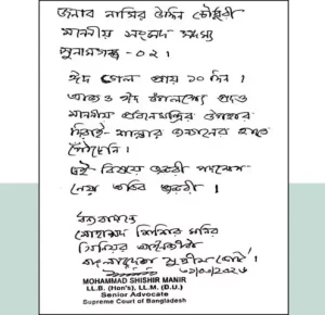 চিঠিতে বলা হয়, ‘ঈদ গেল প্রায় ১০ দিন। আজও ঈদ উপলক্ষে প্রদত্ত মাননীয় প্রধানমন্ত্রীর উপহার দিরাই-শাল্লার জনসাধারণের হাতে পৌঁছেনি। এই বিষয়ে জরুরী পদক্ষেপ নেওয়া অতি জরুরী।’
