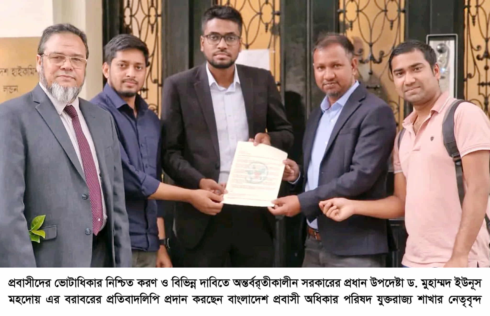 বাংলাদেশ প্রবাসী অধিকার পরিষদ যুক্তরাজ্য শাখার উদ্যোগে প্রবাসীদের ভোটাধিকার নিশ্চিত করণ ও বিভিন্ন দাবি আদায়ের লক্ষ্যে এক প্রতিবাদলিপি প্রদান করা